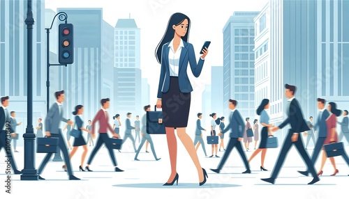 © HaJung, Obraz premium Flat Vector Illustration Businesswoman Mobile Payment Smartphone Candid Focused City Street
