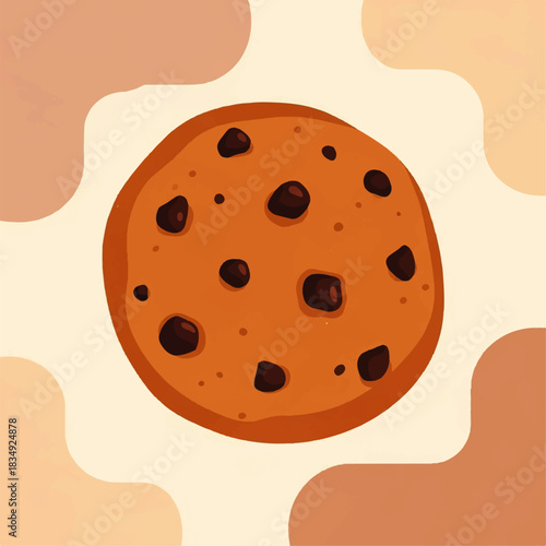 © Zuhrol, Fototapeta premium Flat vector illustration of a delicious chocolate chip cookie on a light brown background with abstract shapes