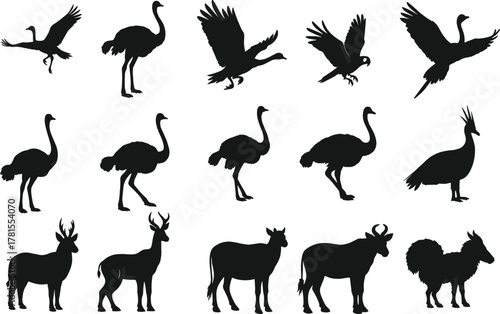 Obraz premium Flat vector illustration of bird and mammal silhouettes including crane, ostrich, deer, goat, sheep, dog in elegant poses