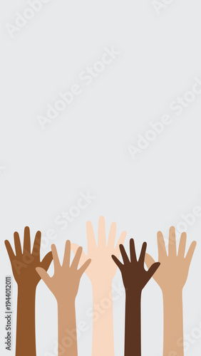 Obraz premium Flat vector illustration of people with different skin colors raising their...