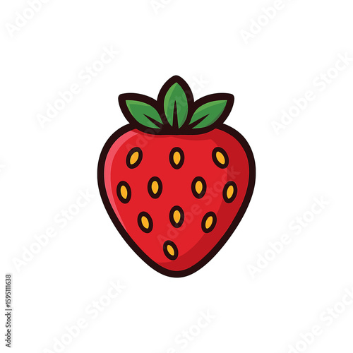 © Noy, Obraz premium Flat Vector Red Strawberry with Seeds and Green Leaves on Transparent Background