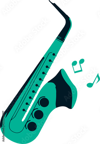 © vectorfusionart, Fototapeta premium Flat vector saxophone is floating diagonally in green and teal with notes, transparent background