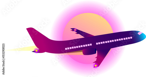 Fototapeta premium Flat vector showing passenger jet with windows soaring over neon circle with transparent background