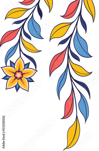 © vectorfusionart, Naklejka premium Flat vector vines are showcasing yellow, coral red, sky blue leaves, flower, transparent background