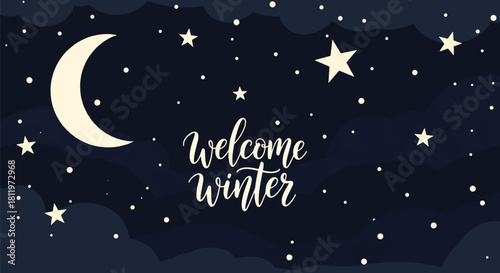 © meeblues, Naklejka premium Flat vector winter night sky wallpaper with stars, moon, and falling snow. Ideal for holiday cards, winter websites, seasonal posters, and calm decorative backgrounds