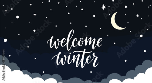 © meeblues, Naklejka premium Flat vector winter night sky wallpaper with stars, moon, and falling snow. Ideal for holiday cards, winter websites, seasonal posters, and calm decorative backgrounds