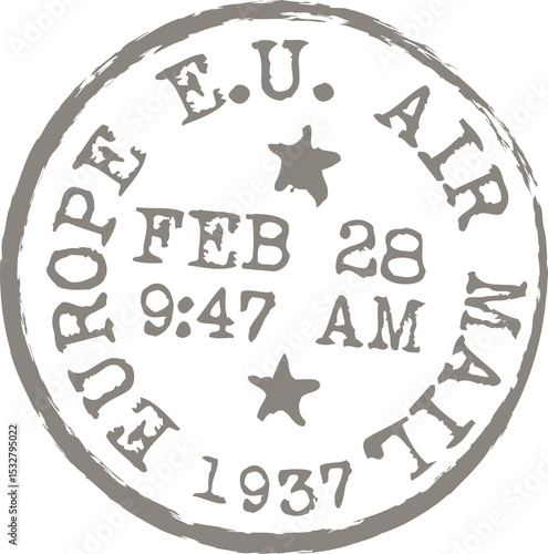 Naklejka premium Flat vintage airmail stamp is featuring worn edges, weathered stars, date on...
