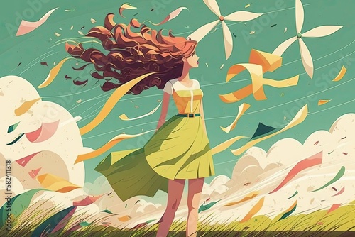 © EnelEva, Fototapeta premium Flat woman Wind Summer Beauty flat cartoon AI Generated