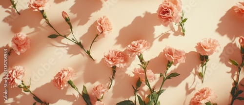 © BerkahStock, Fototapeta premium Flatlay of pink carnations with shadows on a peach background.