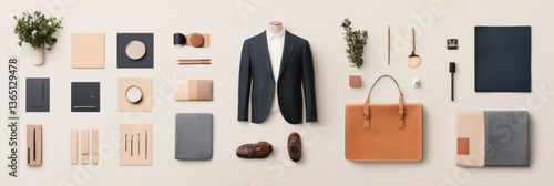© milenialdesastudio, Obraz premium Flatlay showcasing men's attire, leather bag, stationery, and home decor