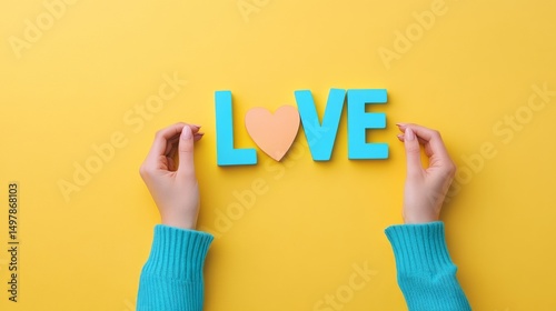 Fototapeta premium Flatlay Teal LOVE Letters and Peach Heart on Yellow, Love Concept, Valentine's Day Valentine's Day, Love