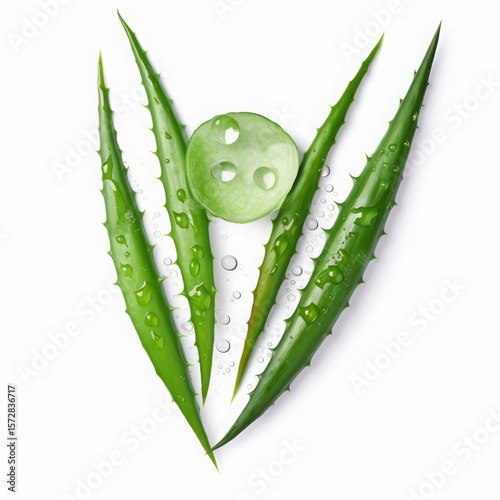 © Faadl, Naklejka premium Flatlay (top view) of Aloe vera cutting leaves with sliced and water drops isolated on white background