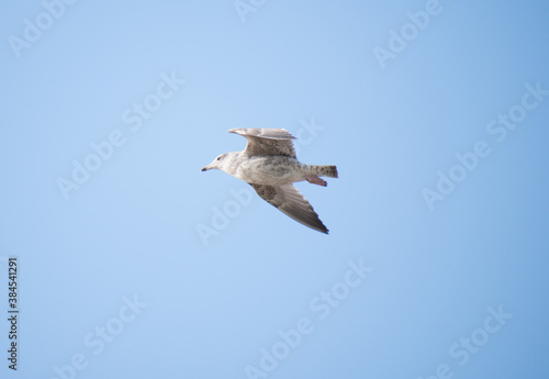 Fototapeta premium Fledgling Herring Gull in Flight with s blue sky background.