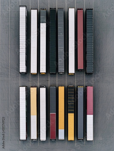 © Achirawee, Naklejka premium Fleet of cargo trucks lined up in a transportation depot, awaiting dispatch under a clear logistics strategy