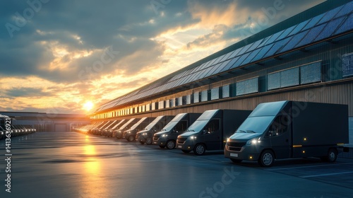 Naklejka premium Fleet of delivery trucks lined up at distribution warehouse during sunset