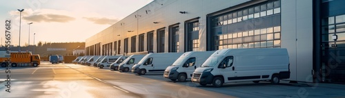 Naklejka premium Fleet of White Delivery Vans Parked Outside a Modern Warehouse at Sunset