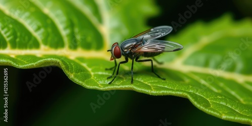 © Chanchai, Fototapeta premium Flesh fly settles on a large leaf with veins, fly, outdoors, environment