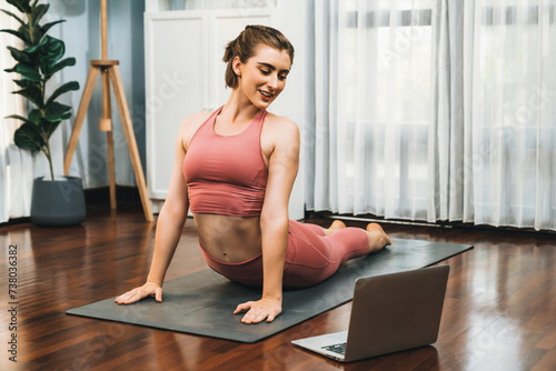 © InfiniteFlow, Fototapeta premium Flexible and dexterity woman in sportswear doing yoga position in meditation posture on exercising mat at home. Healthy gaiety home yoga online training session with peaceful mind and serenity.