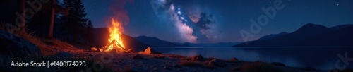 © Thitipa, Naklejka premium Flickering campfire flames illuminate starry night sky , stars, campfire