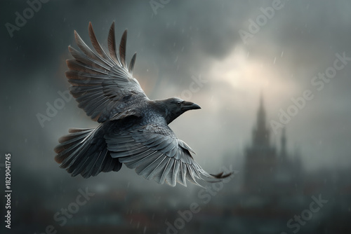 © LElik83, Naklejka premium Fliegende Krähe in natürlicher Umgebung – dynamische Wildtieraufnahme