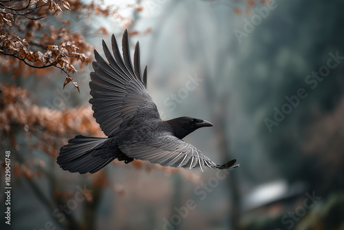 © LElik83, Naklejka premium Fliegende Krähe in natürlicher Umgebung – dynamische Wildtieraufnahme