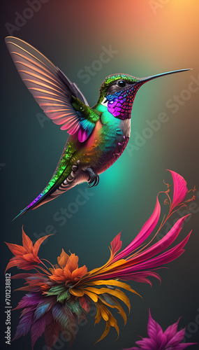 © DeMitoBella, Fototapeta premium fliegender bunter Kolibri über einem buntem Ast