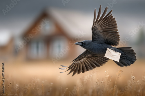 Naklejka premium Fliegender Rabe mit Brief – symbolische Botschaft vor ländlicher Hauskulisse