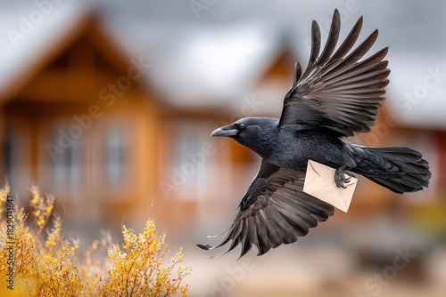 Naklejka premium Fliegender Rabe mit Brief – symbolische Botschaft vor ländlicher Hauskulisse