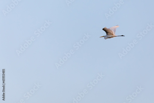 Obraz premium Fliegender, von der Sonne angestrahlter Silberreiher.