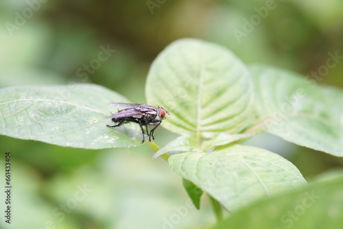 © meechai39, Naklejka premium Flies caught on green leaves.
