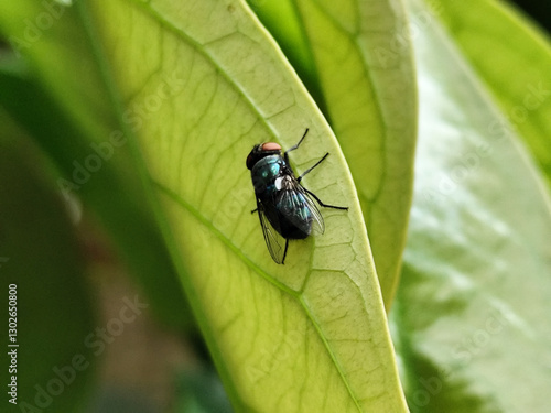 © Wendi, Fototapeta premium Flies with red eyes and thin wings landed on trees. This type is often seen flying in kitchens and trash cans.