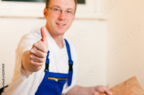 © Kzenon, Obraz premium Fliesenleger auf der Baustelle