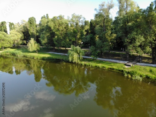 © virythtpehjljd89, Fototapeta premium flight over the river in a city park among trees