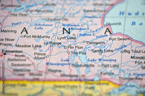 © BlueMistFilmStudios, Naklejka premium Flin Flon Manitoba Canada Location on World Map with Defocused Background Geography Concept