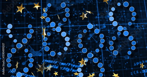 © vectorfusionart, Naklejka premium Floating blue nodes and golden stars over dark blue grid, showing code text and network lines