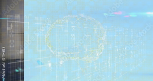 Fototapeta premium Floating brain hologram glowing over data center binary code grid with server...