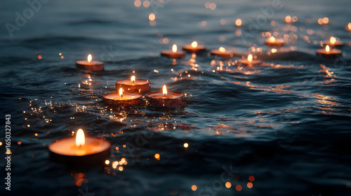 Fototapeta premium Floating Candles on Dark Water at Night