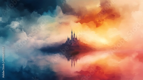 Fototapeta premium Floating Castles in a Rainbow Sky, Enchanting landscape with whimsical...