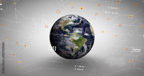 Obraz premium Floating central Earth globe showing network lines and orange data markers on...