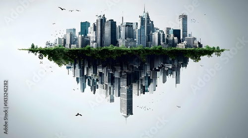 Obraz premium Floating city skyline with green base, birds flying, reflection;...