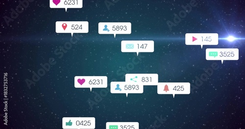 Fototapeta premium Floating cluster of speech-bubble labels drifting over starfield backdrop, showing colored icons