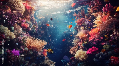 Fototapeta premium Floating coral reef illuminated by bioluminescent coral, the vibrant colors...