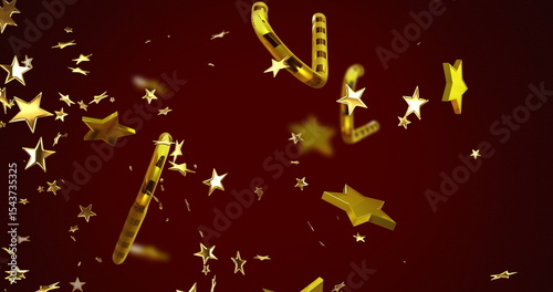 Fototapeta premium Floating 3D golden stars and candy-cane striped tubes drifting against...