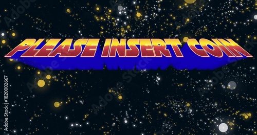 Fototapeta premium Floating 3D text reading PLEASE INSERT COIN over navy starfield, with small...