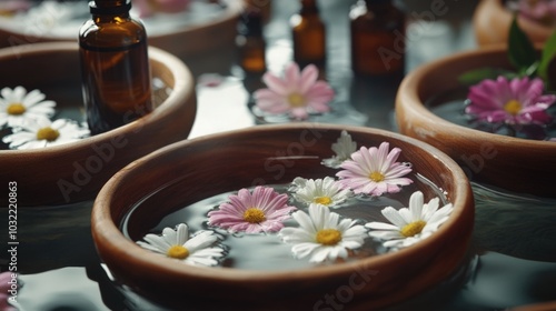 Naklejka premium Floating daisies in wooden bowls with aromatherapy oils for tranquil water wellness