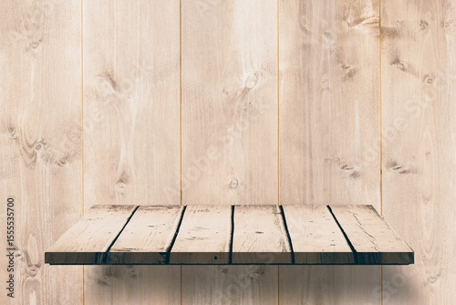 Obraz premium Floating distressed wooden shelf is hanging on light wood-paneled wall in minimalist flat design
