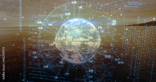 © vectorfusionart, Obraz premium Floating Earth globe above sea at sunset showing numeric data labels, code streams, orbital paths