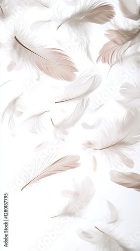 © A Denny Syahputra, Obraz premium Floating Feathers: A Serene Image of Delicate, Light Brown and White Feathers Against a Pure White Background