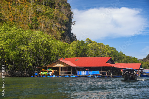 © Khrystsina, Fototapeta premium Floating Fish Farm on Andaman Sea. Mangroves forest tour. Langkawi Island. Vacation and holidays in Malaysia