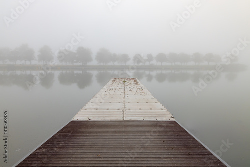 © Martina, Fototapeta premium Floating fishing pier in the fog with treeline in background